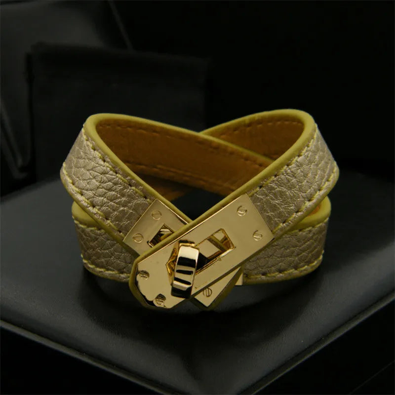 Αυτό είναι ένα κομψό και στυλάτο διπλό δερματίνης βραχιόλι με μεταλλική ασημένια όψη και ανάγλυφη υφή. Διαθέτει κούμπωμα τύπου λουκέτου σε χρυσή απόχρωση, που προσθέτει μια πινελιά πολυτέλειας και φινέτσας. Η εσωτερική επένδυση είναι σε ζεστό καραμελέ χρώμα, προσφέροντας άνετη εφαρμογή. Ιδανικό τόσο για casual όσο και για επίσημες εμφανίσεις, αυτό το αξεσουάρ είναι ένα ευέλικτο κομμάτι δήλωσης στυλ.