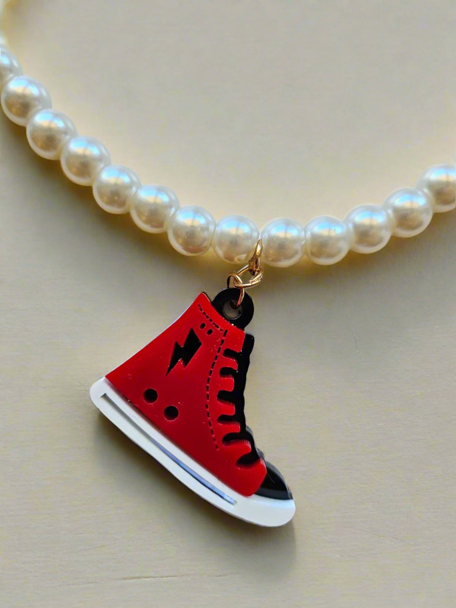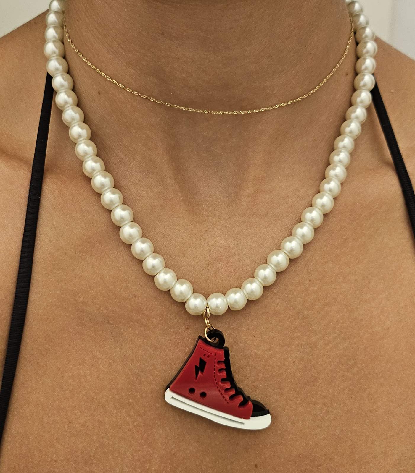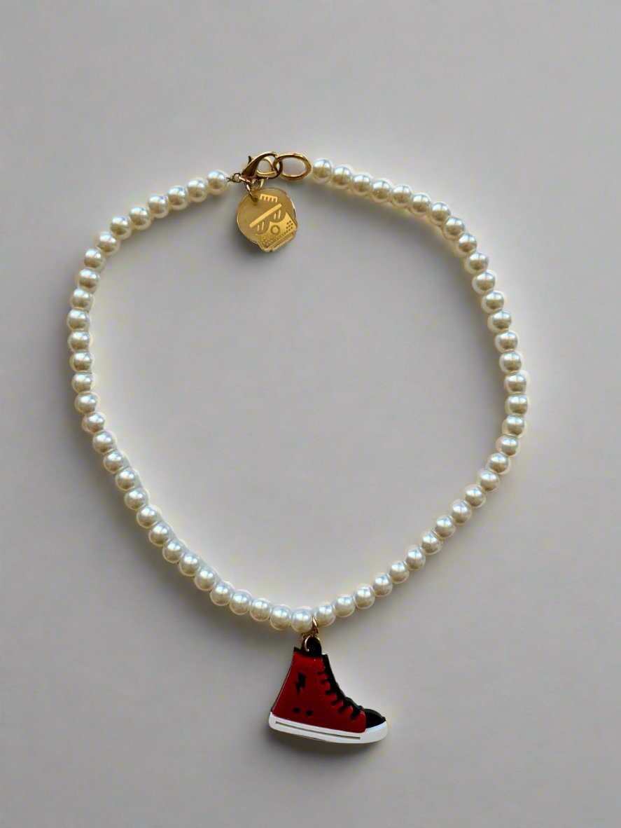 The Allstar Luxe Necklace is a modern fusion of classic elegance and urban edge. Featuring lustrous 6mm pearls that create a timeless and refined look, the necklace is elevated by a striking 30x40mm plexiglas element, inspired by the iconic Allstar sneaker. This bold centerpiece adds a contemporary twist, blending streetwear with sophistication. The juxtaposition of smooth, shimmering pearls with the sleek, plexiglas makes this necklace a statement piece, perfect for those who appreciate fashion-forward accessories with a touch of luxury.
