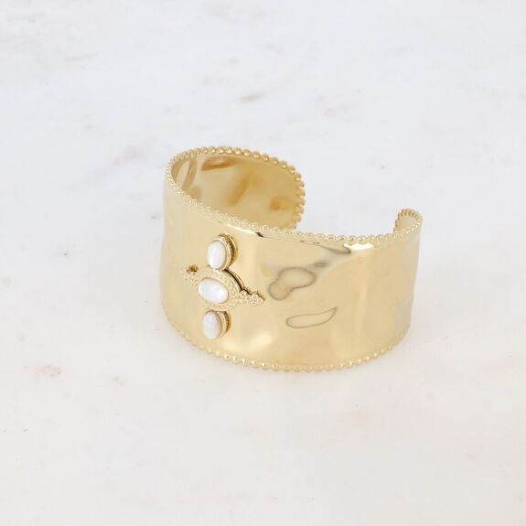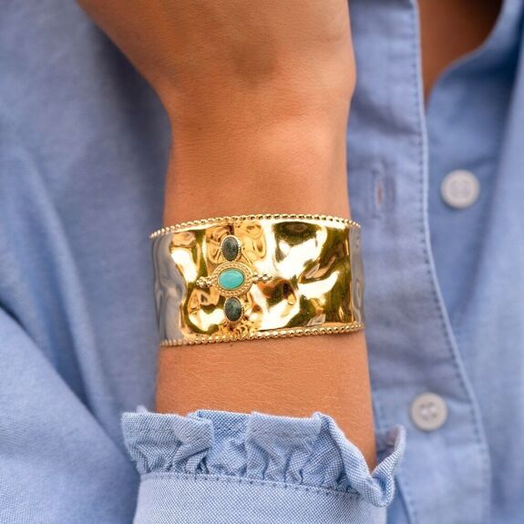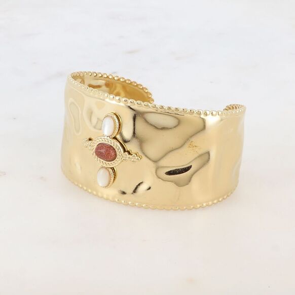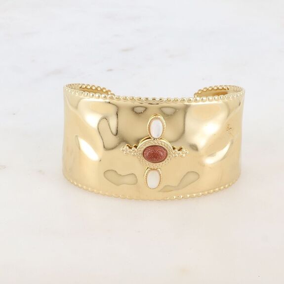 Slightly hammered cuff type bracelet with rounded contours in stainless steel composed of 3 oval natural stones.