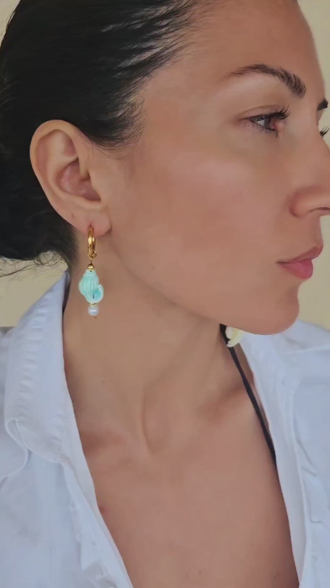 Necklace featuring blue jade chips and handcrafted ceramic seashells — a fresh and beachy piece inspired by coastal charm.