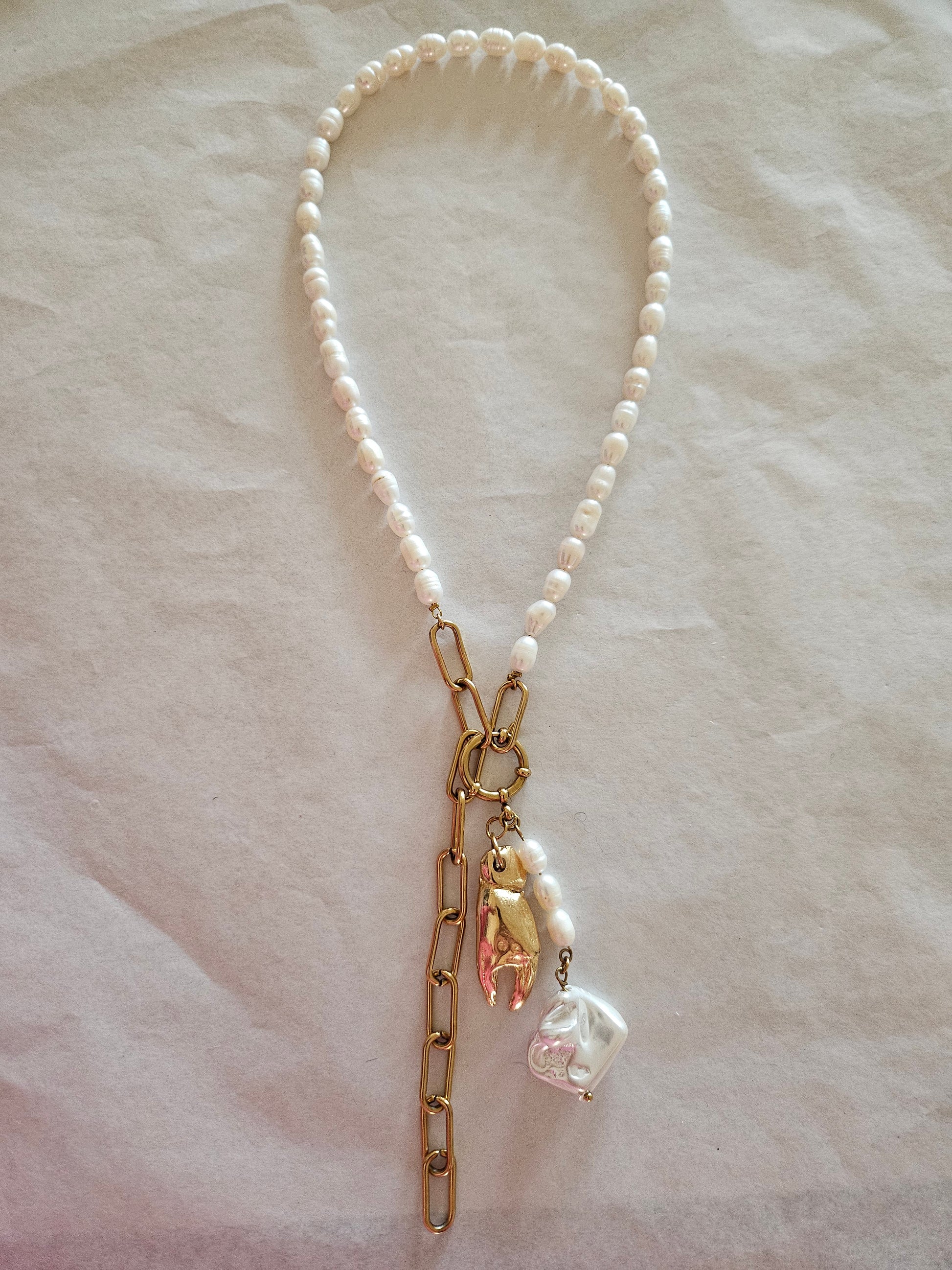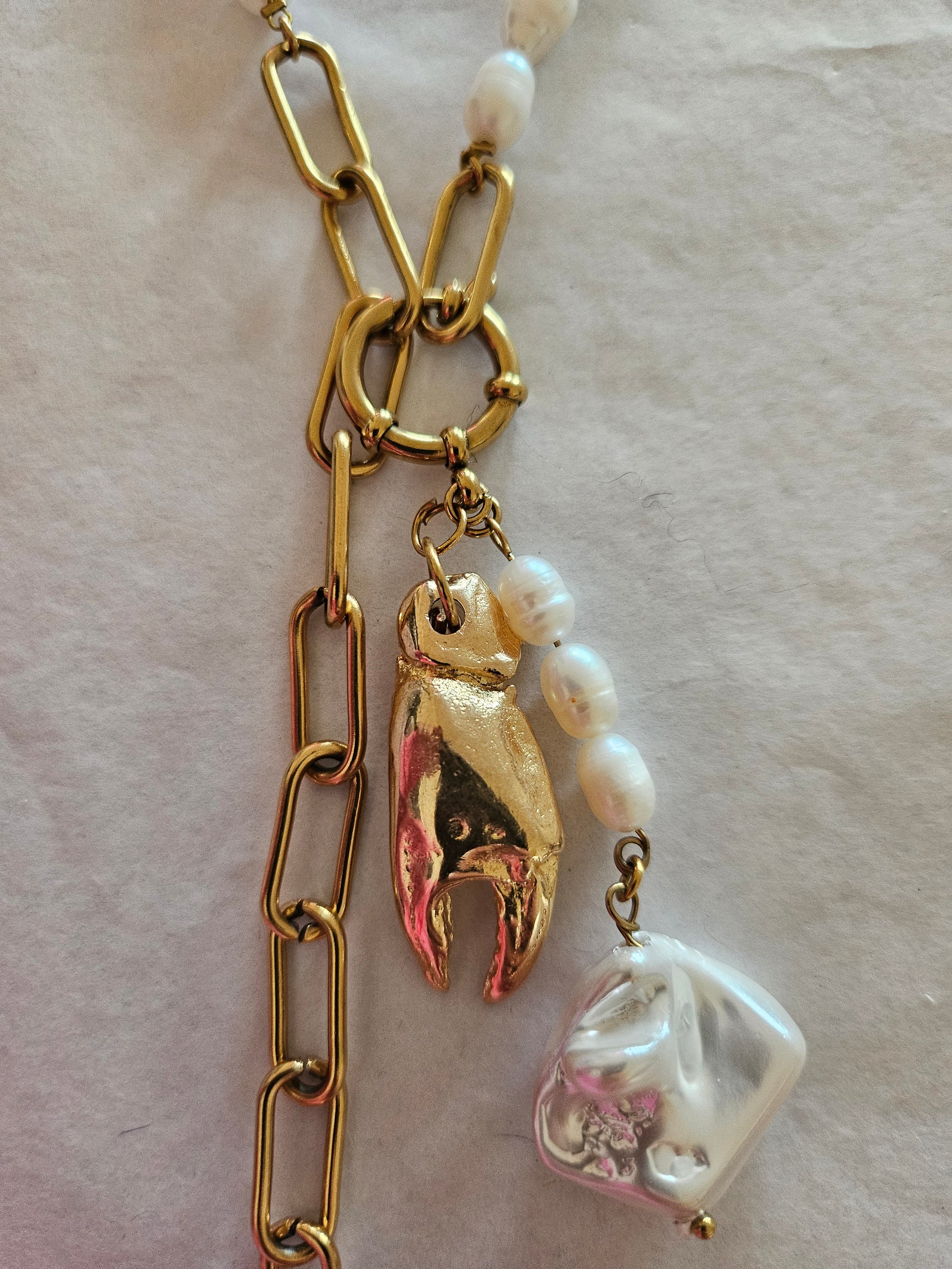Necklace with a stainless steel chain, natural pearls, mother-of-pearl, and a crab claw charm. The adjustable stainless steel clasp can slide along the chain, allowing you to wear it either as a choker or longer, depending on your style or mood.