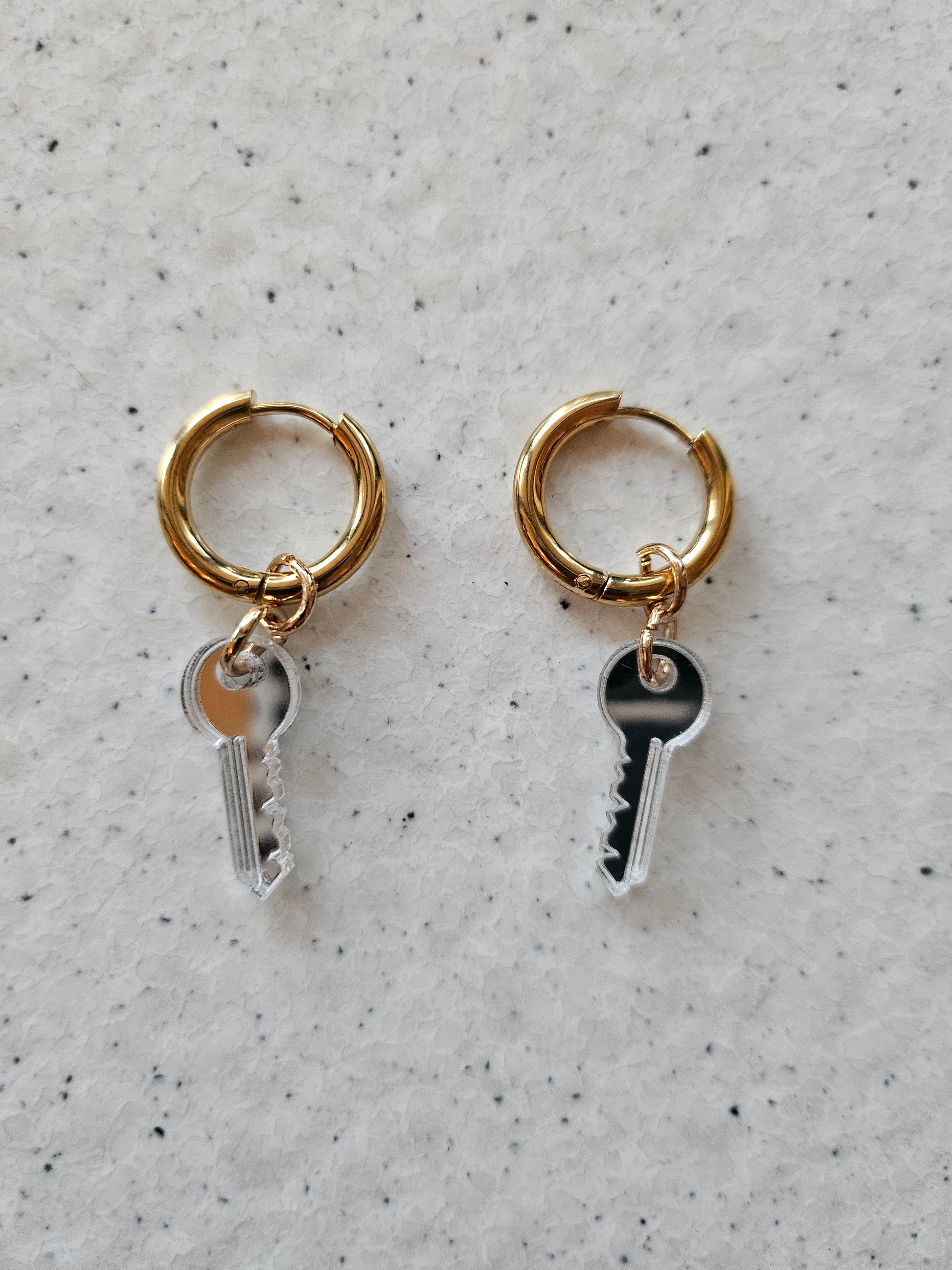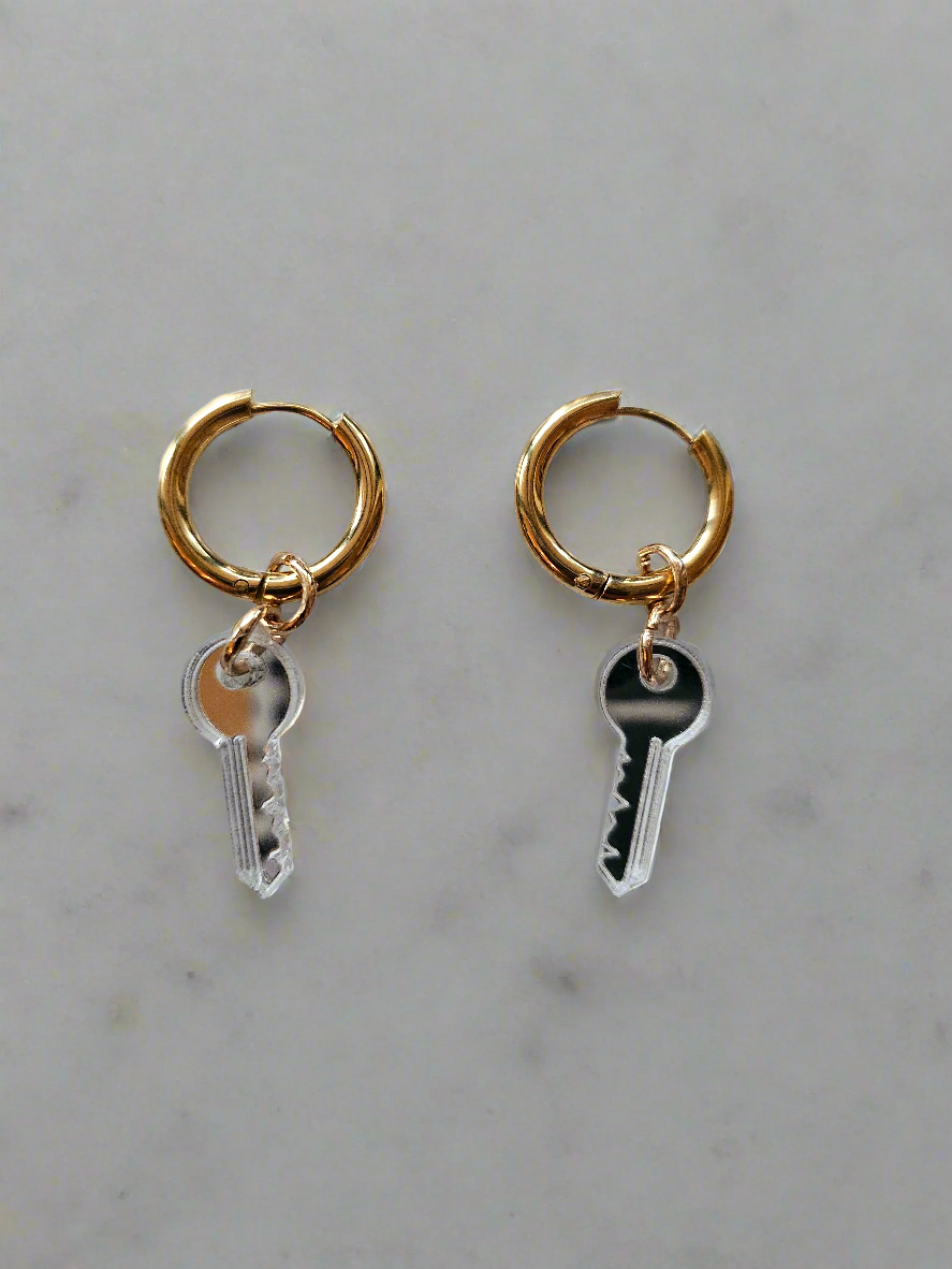 These sleek "Silver Key Drops" are crafted from mirrored plexiglass, offering a modern and reflective finish. Measuring 2cm in length, they add a subtle yet eye-catching touch to any outfit. Lightweight and stylish, perfect for everyday wear or special occasions.