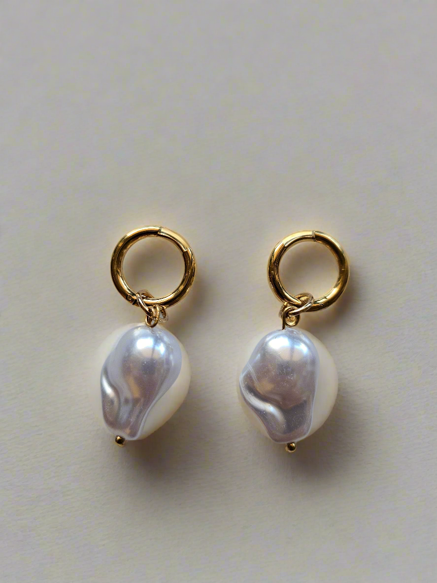 These earrings feature baroque-style acrylic pearls on 16mm gold stainless steel hoops, combining modern elegance with timeless charm for a lightweight, sophisticated look.