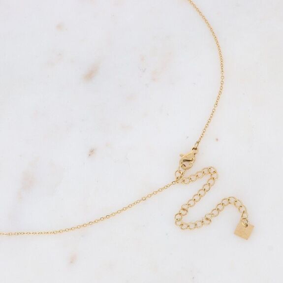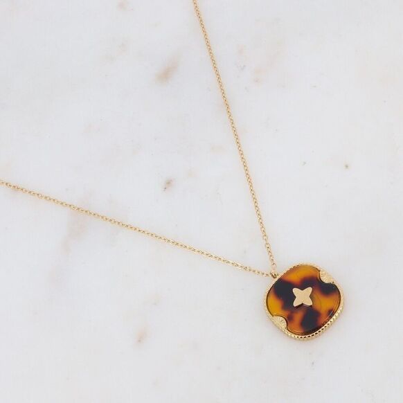Stainless steel necklace composed of a hammered star placed on a rounded square tinted acetate.