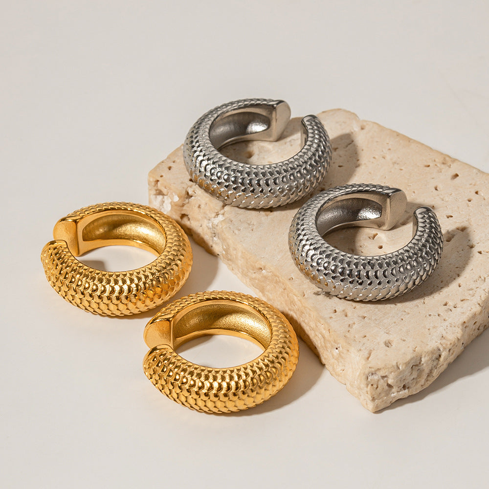 A stylish snake texture stainless steel cuff, durable, hypoallergenic, and perfect for a bold, modern look.