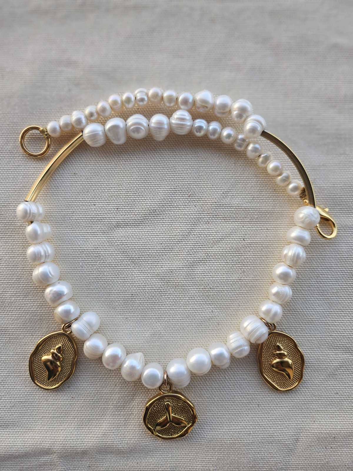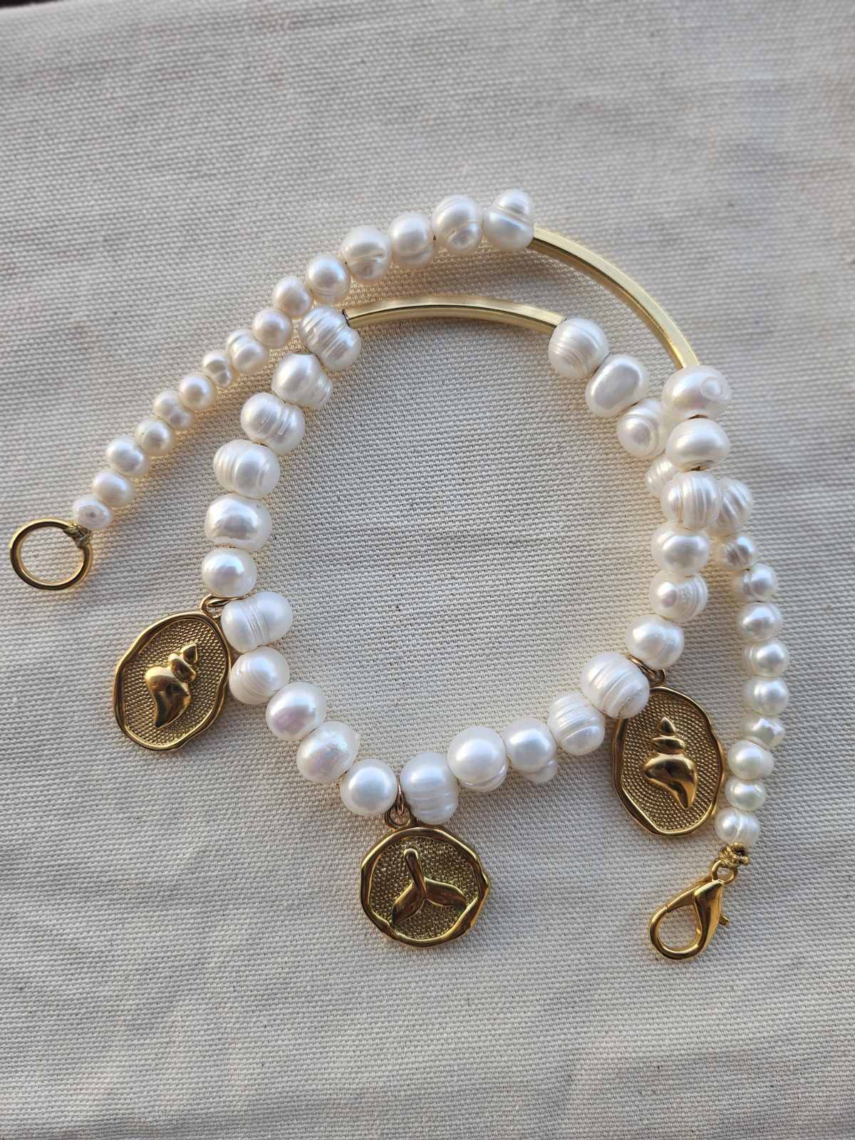 Handcrafted necklace featuring freshwater pearls and gold-plated stainless steel elements in a Seashell design.