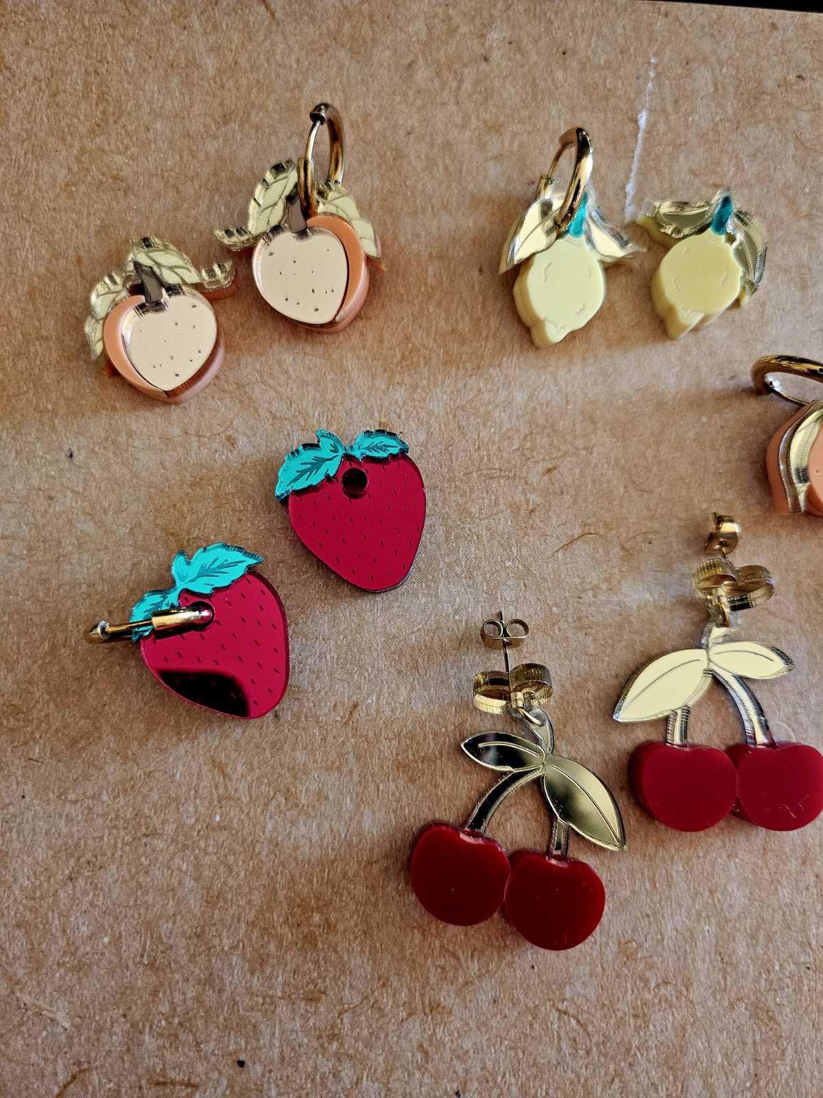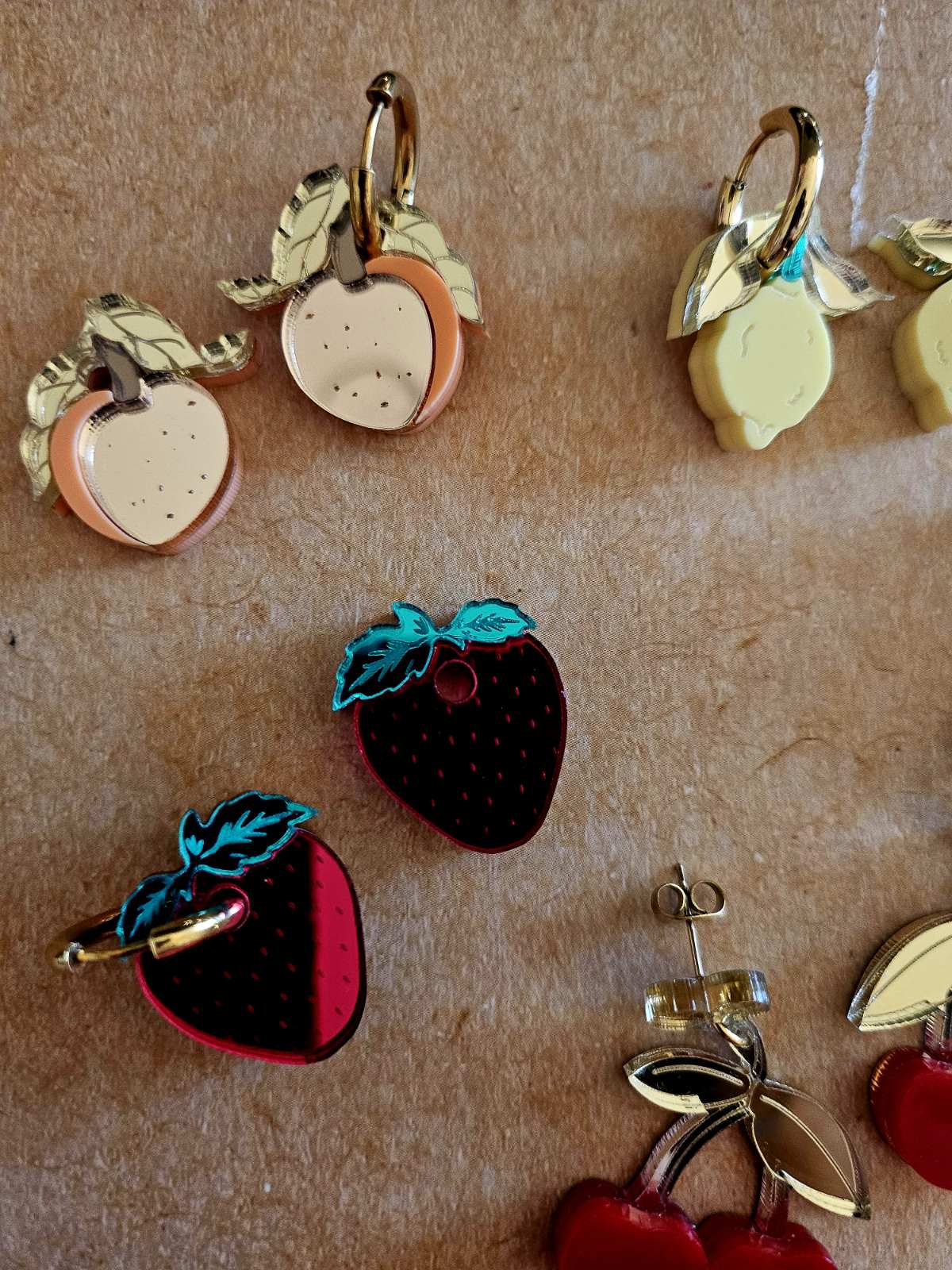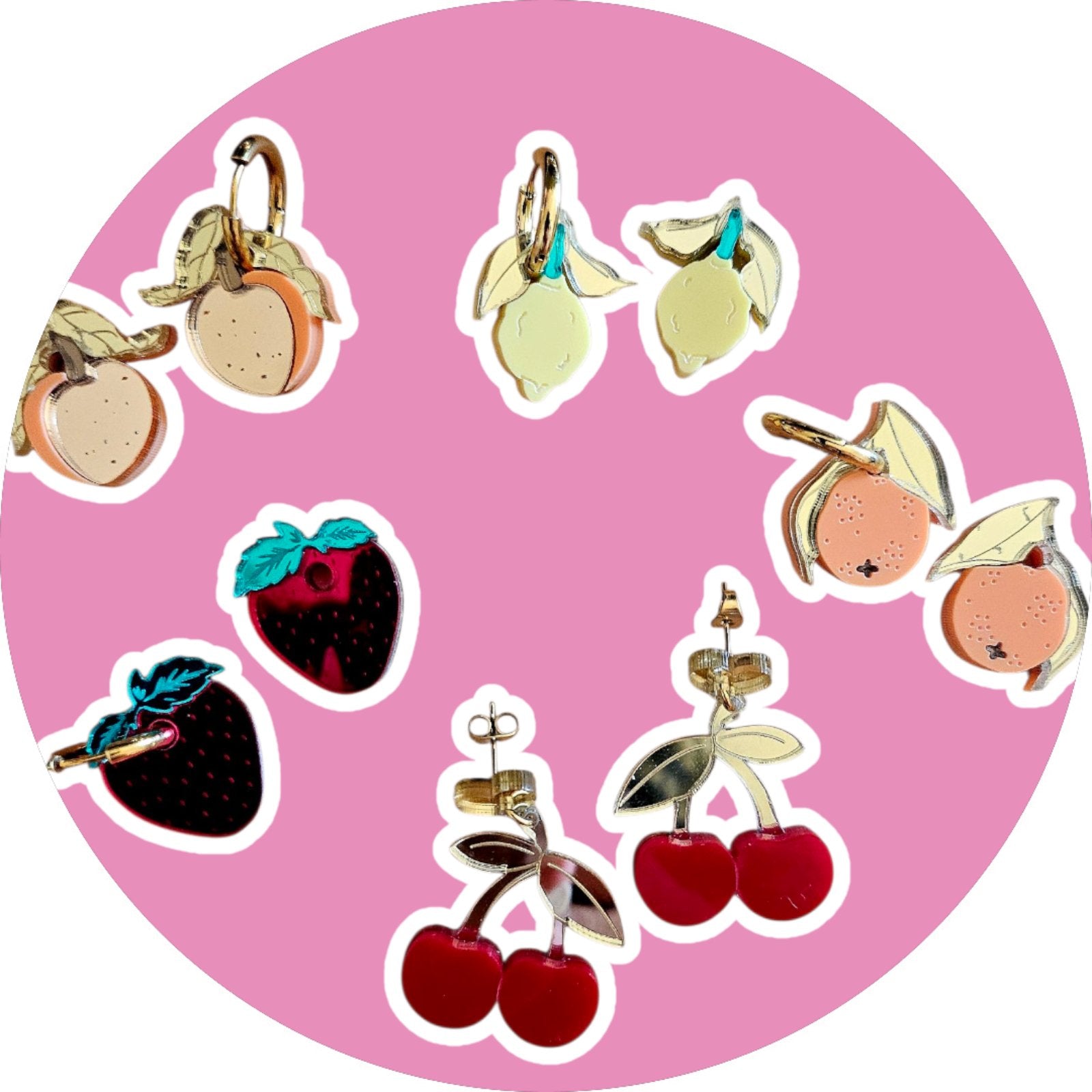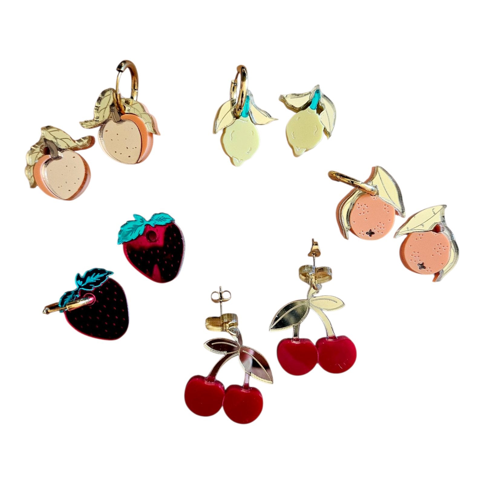 Handmade fruit earrings crafted from lightweight and durable plexiglass, full of color and playful charm. Choose from cherries, oranges, strawberries, peaches, and lemons — each one bursting with fresh summer vibes and a bold, cheerful look.