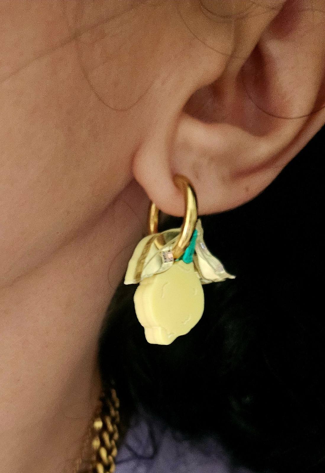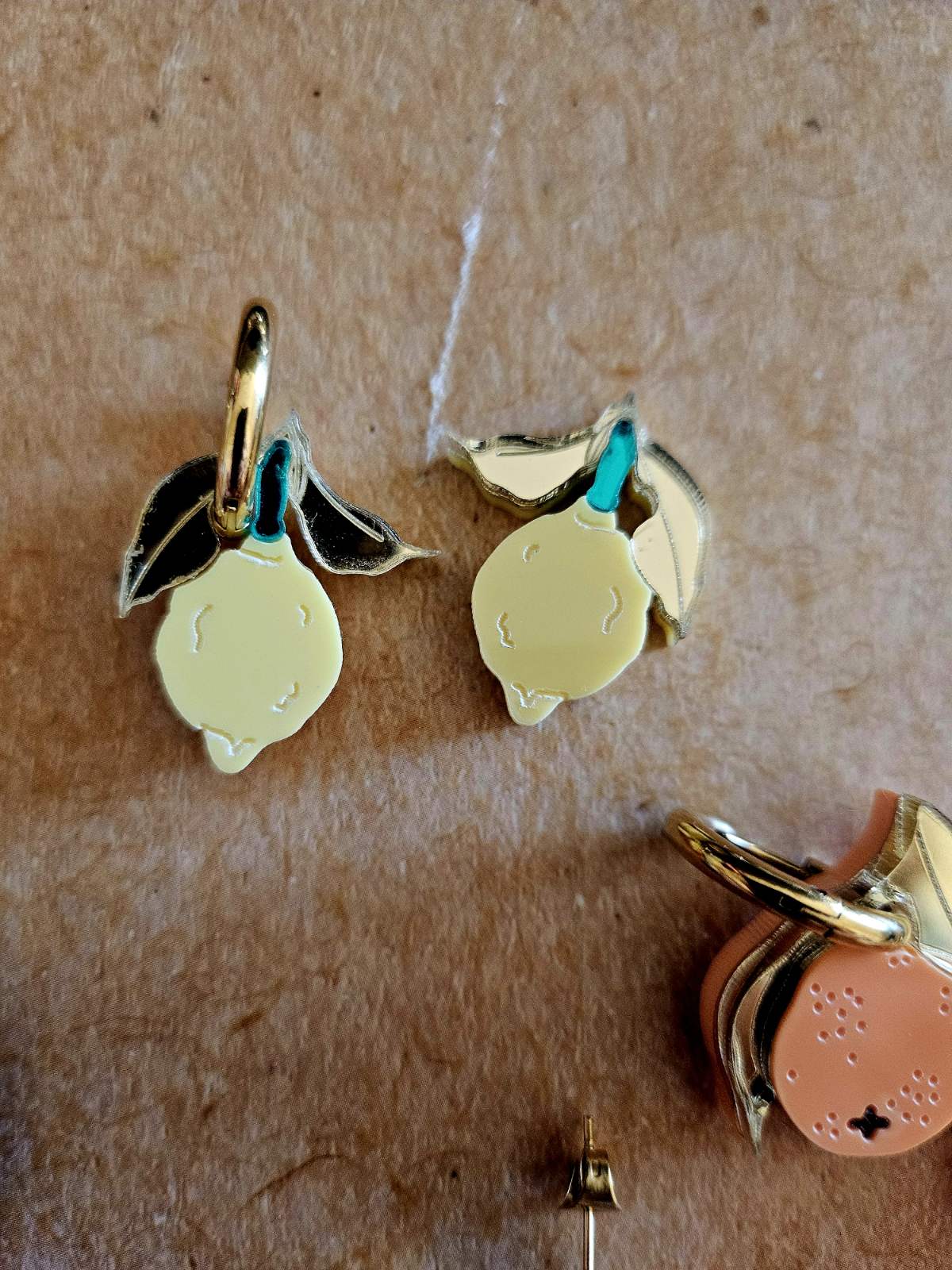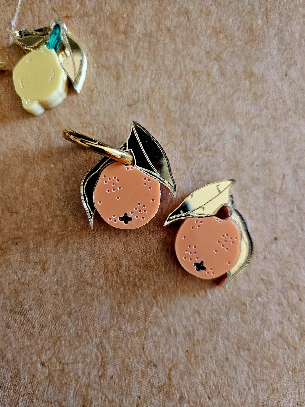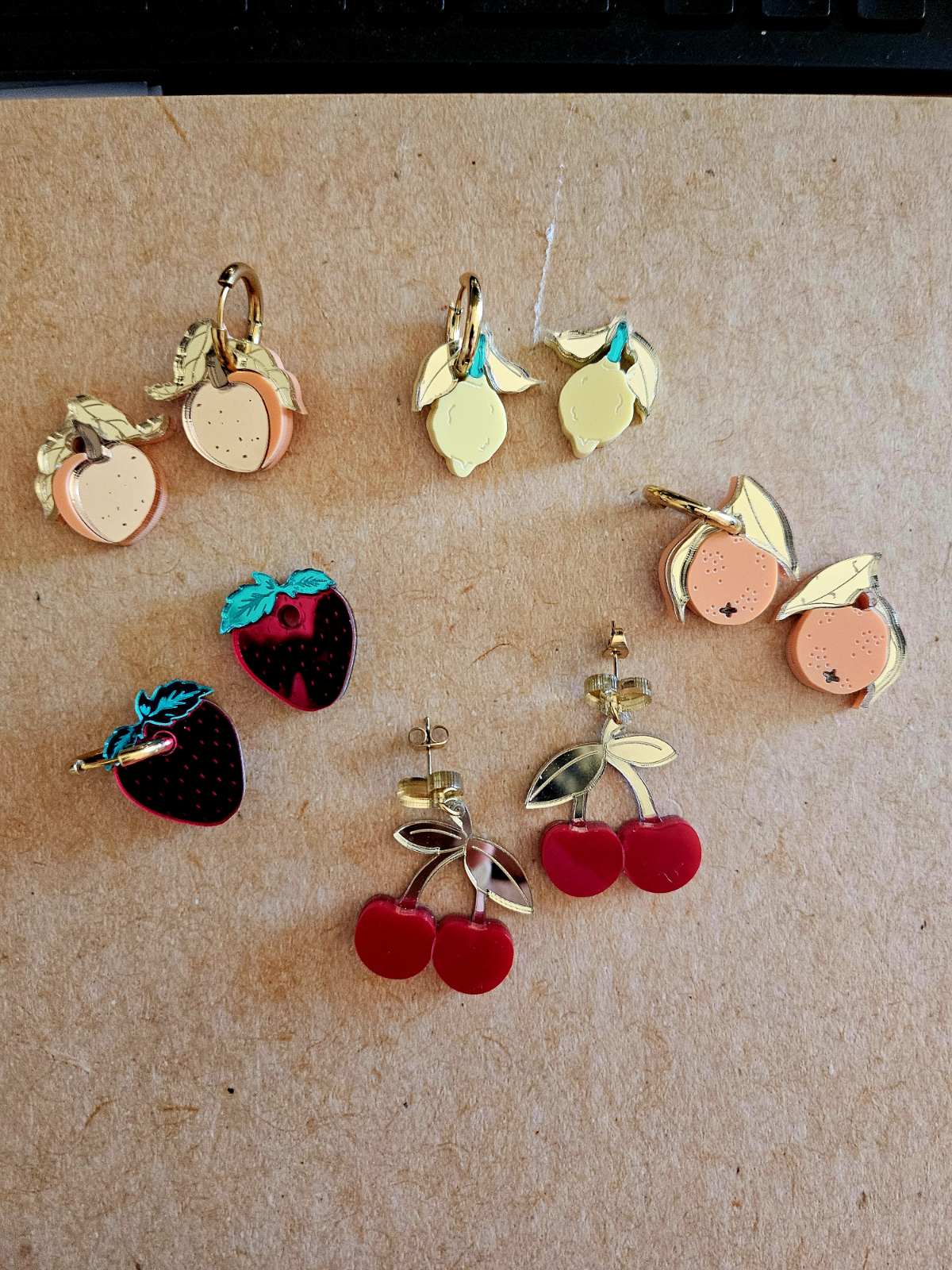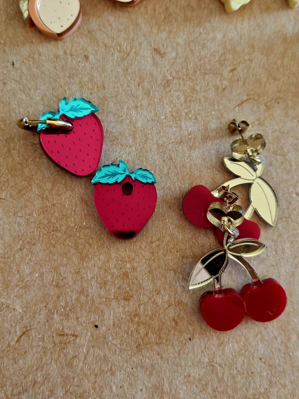 Handmade fruit earrings crafted from lightweight and durable plexiglass, full of color and playful charm. Choose from cherries, oranges, strawberries, peaches, and lemons — each one bursting with fresh summer vibes and a bold, cheerful look.