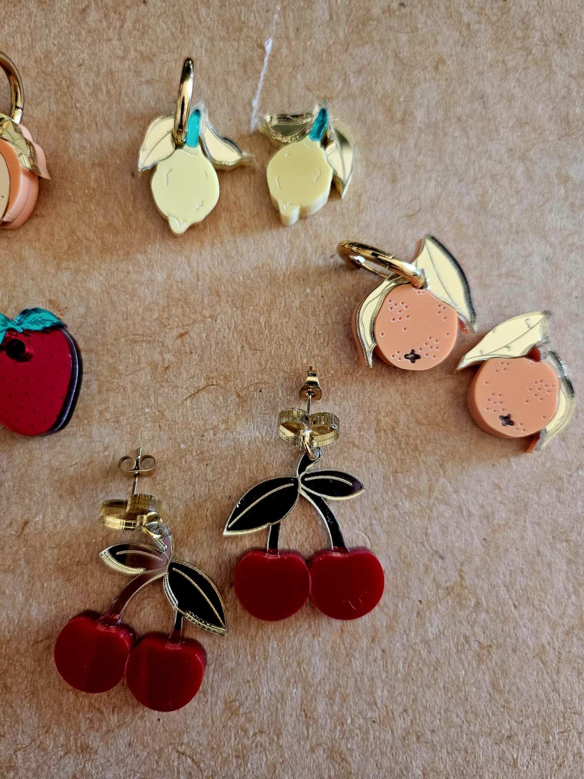 Cherry earrings measure 4 cm; orange, strawberry, peach, and lemon designs are 2.5 cm.