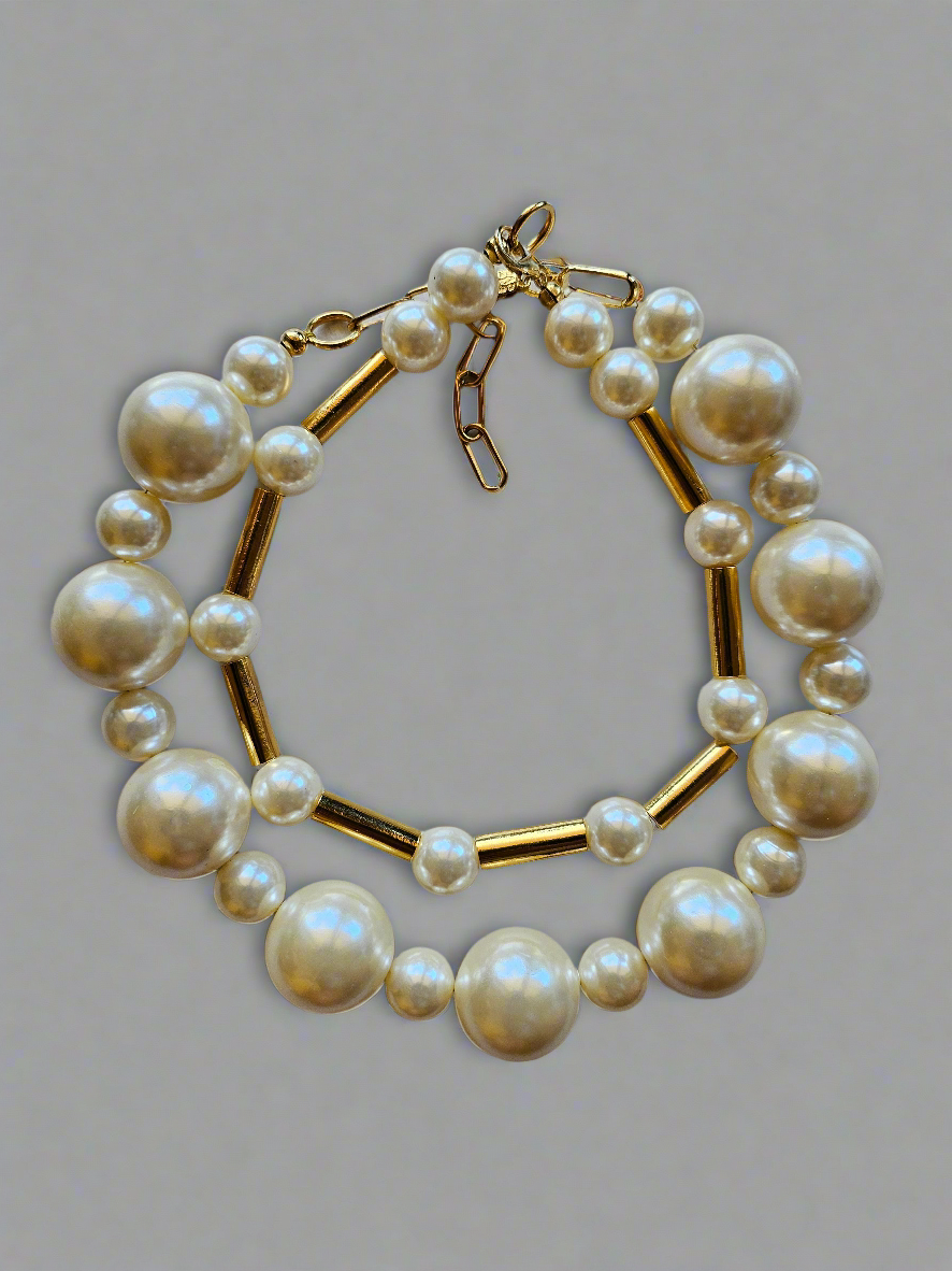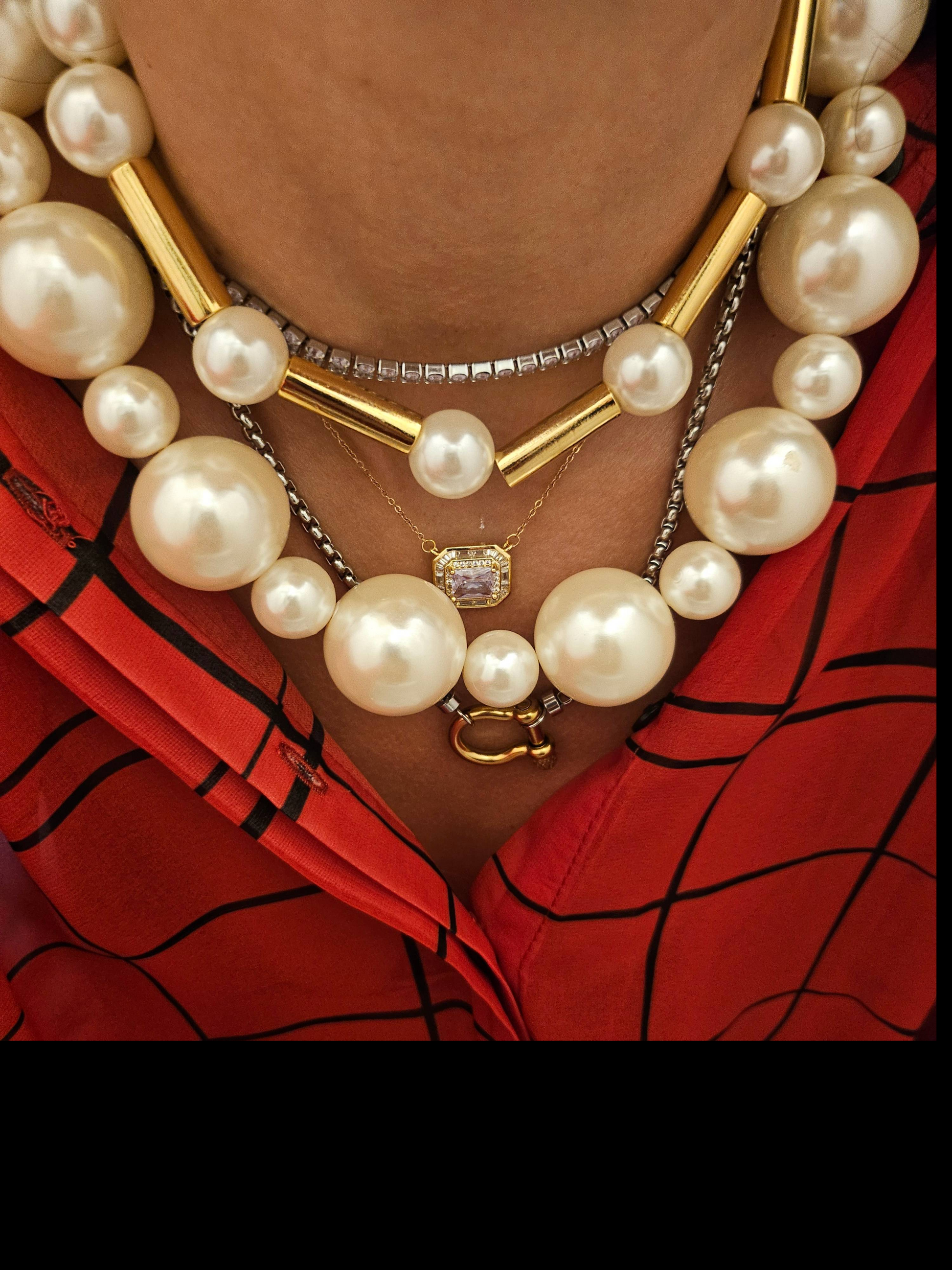 When worn together, these two necklaces create a truly exquisite combination. The Grandeur Pearl Necklace offers bold, luxurious appeal, while the Gold & Pearl Harmony Necklace brings sleek elegance. Together, they elevate your ensemble with a unique mix of contemporary and classic style, perfect for any occasion that calls for both grace and statement-making fashion.