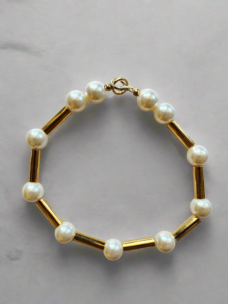 A delicate fusion of gleaming gold tubes and 16mm pearls, this necklace offers a sleek, modern aesthetic with classic charm. The polished gold tubes provide a subtle yet glamorous contrast to the smooth, luminous pearls, making this piece versatile enough for both daytime chic and evening elegance. The clean lines and refined design create a sophisticated look that enhances any wardrobe.