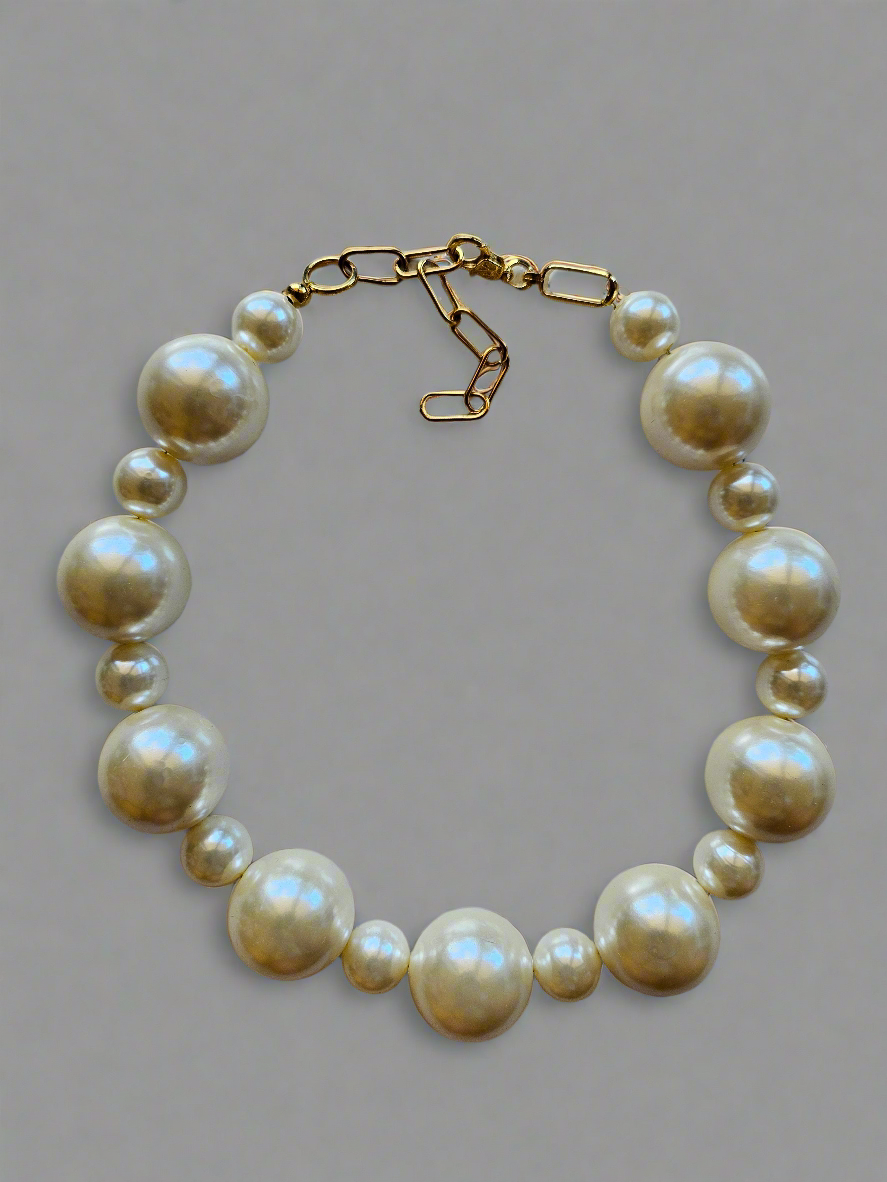 This statement piece features a stunning combination of pearls in two distinct sizes. Large, lustrous pearls measuring 30mm in diameter alternate with elegant 16mm pearls, creating a striking balance of boldness and refinement. The oversized pearls radiate luxury and sophistication, making this necklace perfect for those who want to make a memorable impression. Its timeless design is ideal for formal occasions or to elevate any outfit with a touch of opulence.