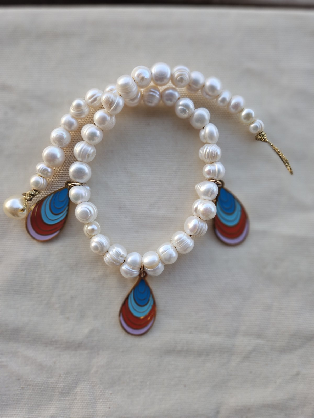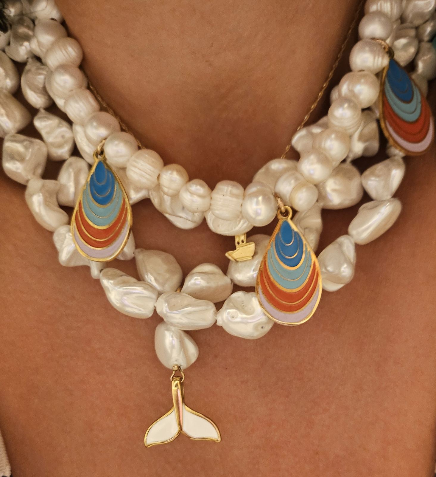 Handcrafted necklace featuring freshwater pearls and gold-plated stainless steel elements in a mussel shell design.