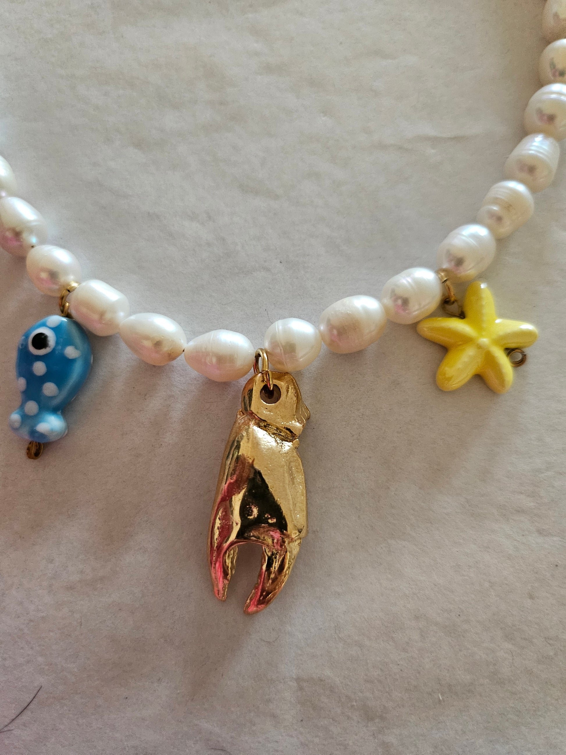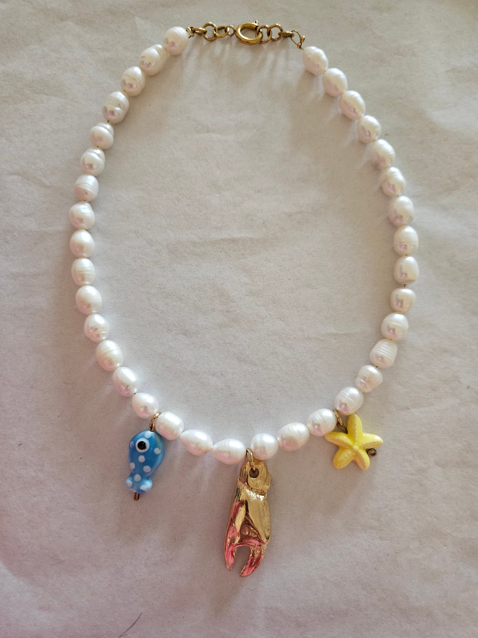 Necklace featuring natural pearls, ceramic elements, and a gold-plated metal claw charm — a unique piece that blends classic elegance with modern artistic touches.