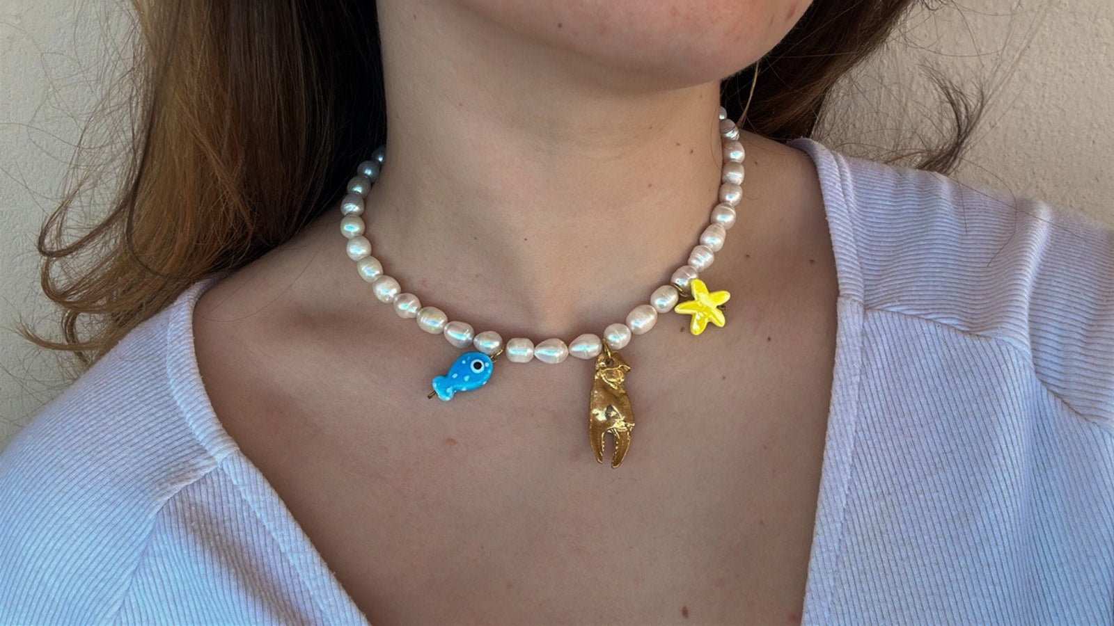 The luminous pearls bring timeless sophistication, while the handcrafted ceramic details add texture and character. The gold-plated claw charm completes the look with a subtle shine and contemporary edge. Perfect worn alone or layered with other delicate necklaces.