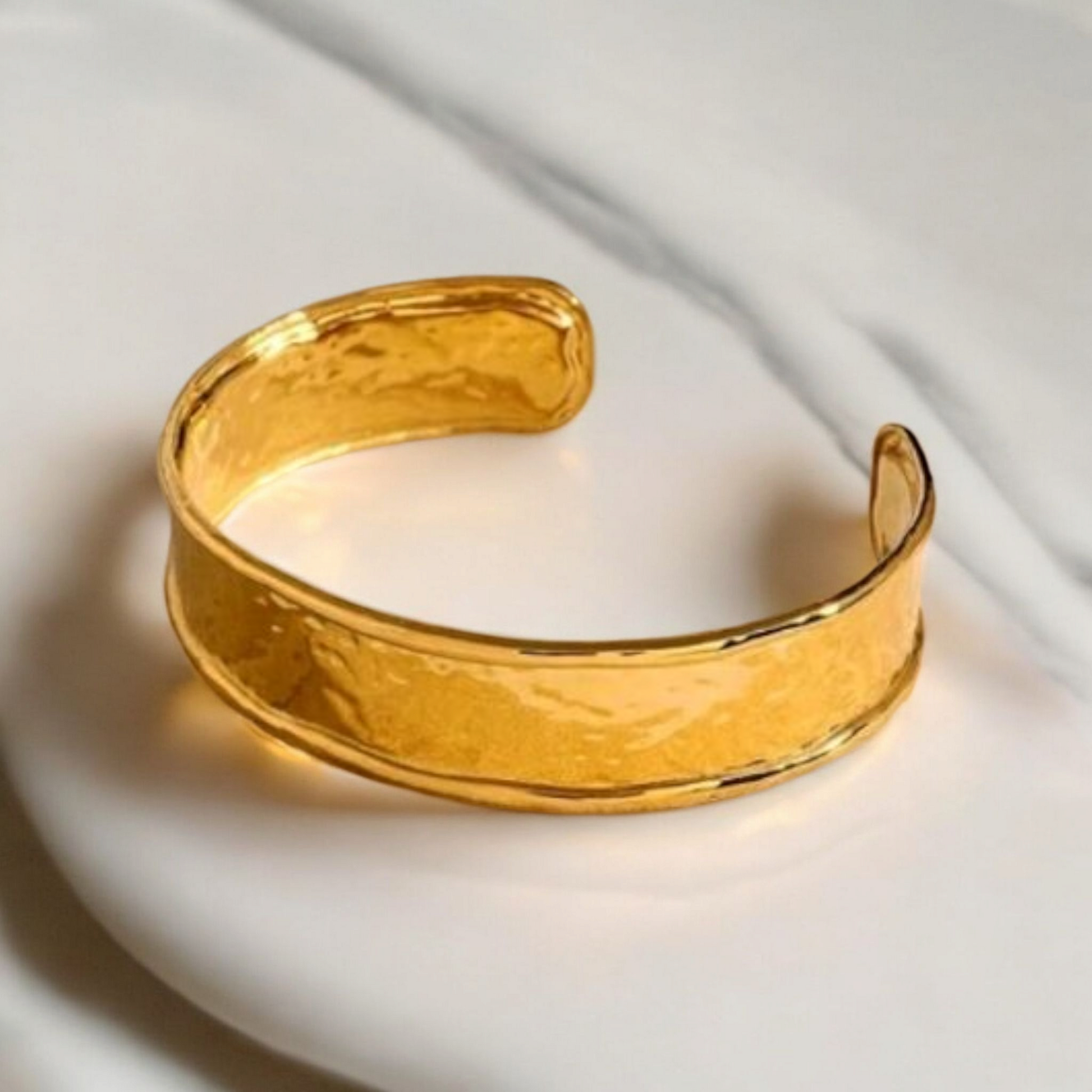 The **Sophia Cuff Bracelet** is a handcrafted, wide, open cuff made from 18k gold-plated stainless steel, featuring a bold geometric, textured design.