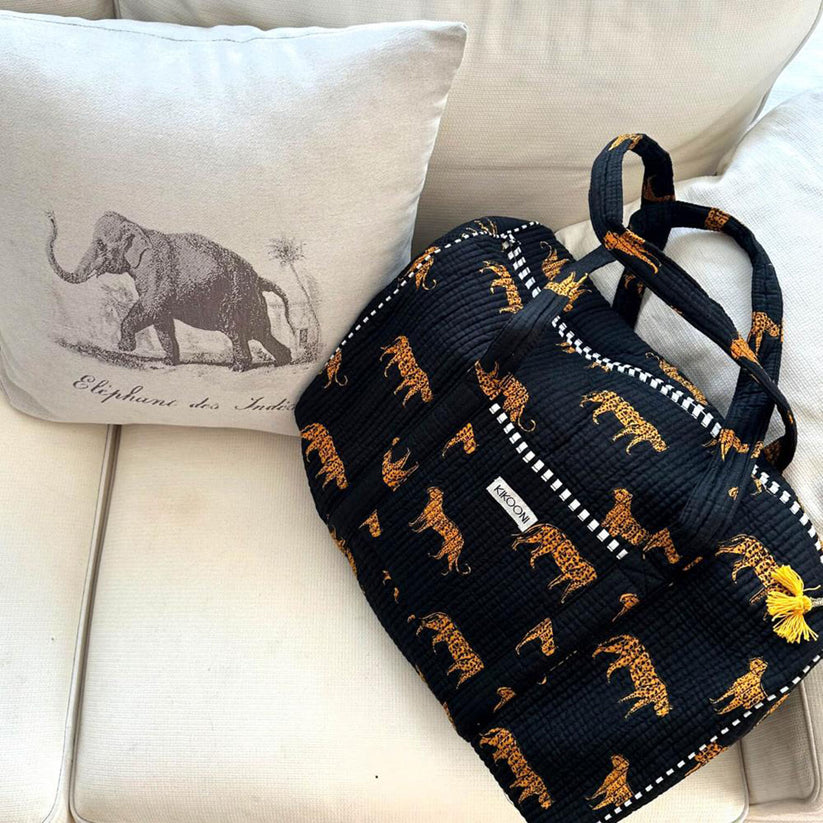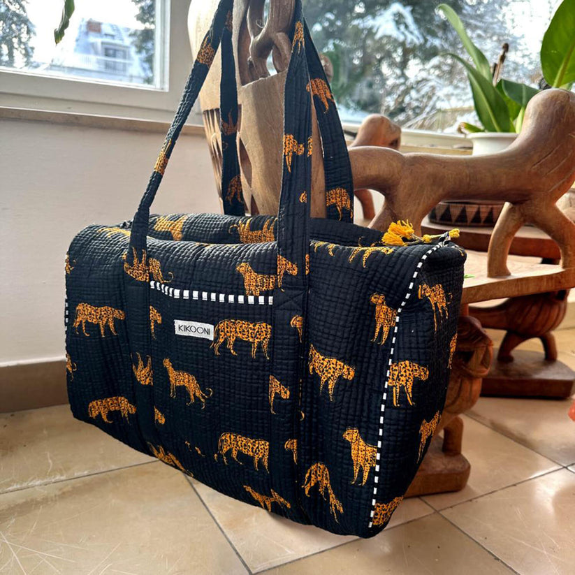 Handmade large cotton bag "Black Leopard" your unique sports bag, beach bag, weekend bag made of hand-printed cotton.