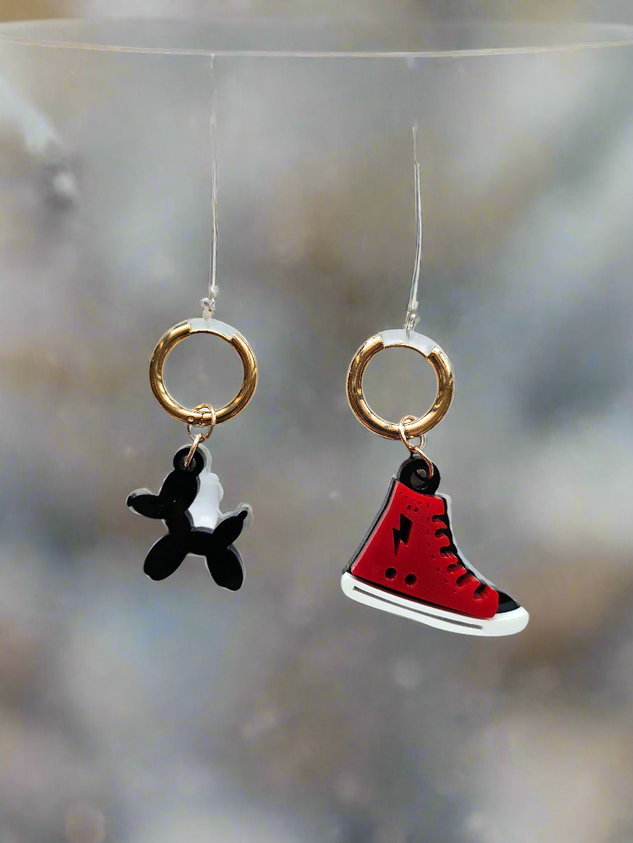 Featuring a 3cm All-Star shoe and a 2cm black dog balloon, both crafted from plexiglass, these earrings are sure to stand out.