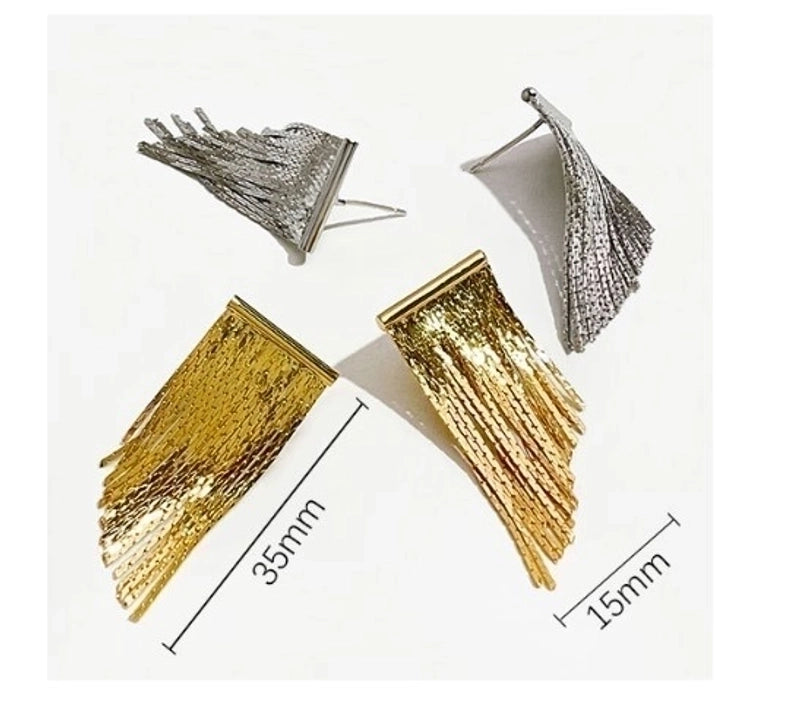 Stylish tassel drop earrings in gold and silver, featuring a cascading design for a chic, versatile look. Perfect for any occasion.